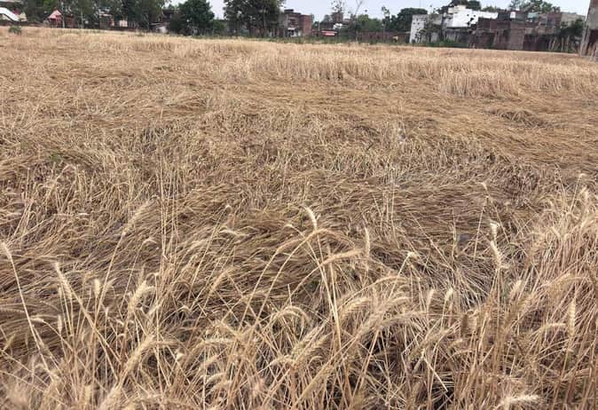 फोटो-23- बलरामपुर के पेहर बाजार में हवा चलने से गिरी गेहूं की फसल। संवाद