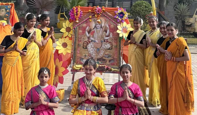 बलरामपुर के पायनियर पब्लिक स्कूल में मां सरस्वती की पूजा अर्चना करती छात्राएं ।-स्रोत: स्कूल