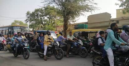 फोटो-28-बलरामपुर के संतोषीमाता मंदिर क्रासिंग के पास लगे जाम में फंसे लोग ।-संवाद
