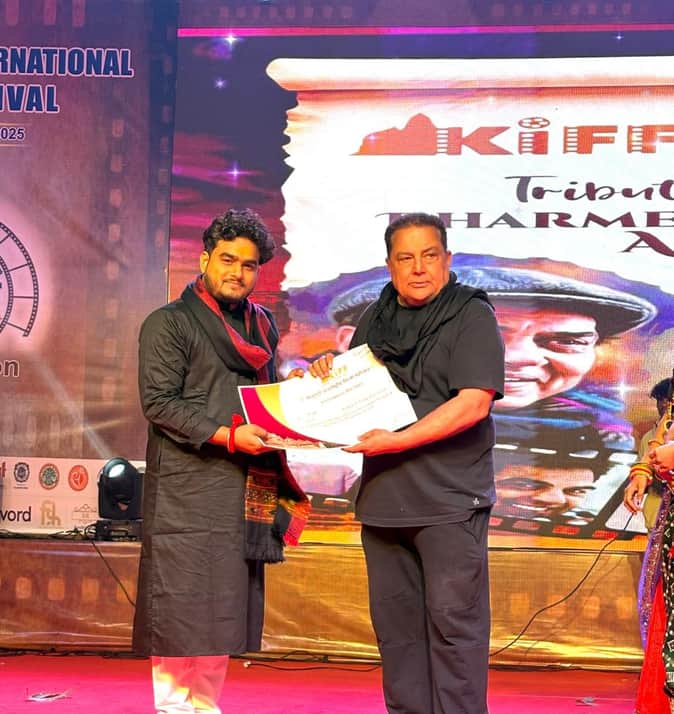 खजुराहो फिल्म महोत्सव में रामजी को सम्मानित करते फिल्म अभिनेता राजा बुंदेला। स्वयं