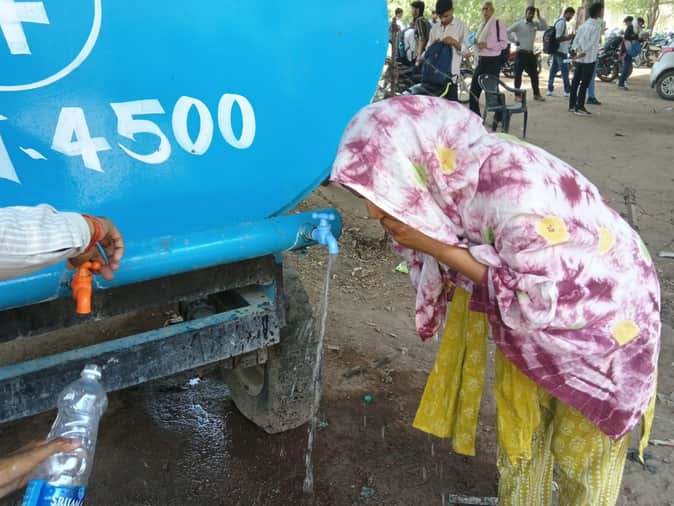 पानी के टैंकर से प्यास बुझाती परीक्षा देने आई अभ्यर्थी। संवाद