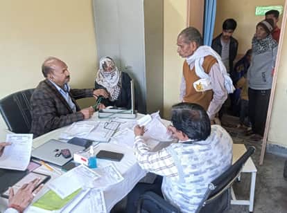 प्राथमिक स्वास्थ्य केंद्र त्रिलोकपुर पर मुख्यमंत्री आरोग्य मेले में मरीजों को देखते चिकित्सक।