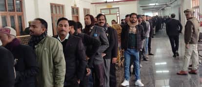 कचहरी में मतदान के लिए लाइन में लगे अधिवक्ता।