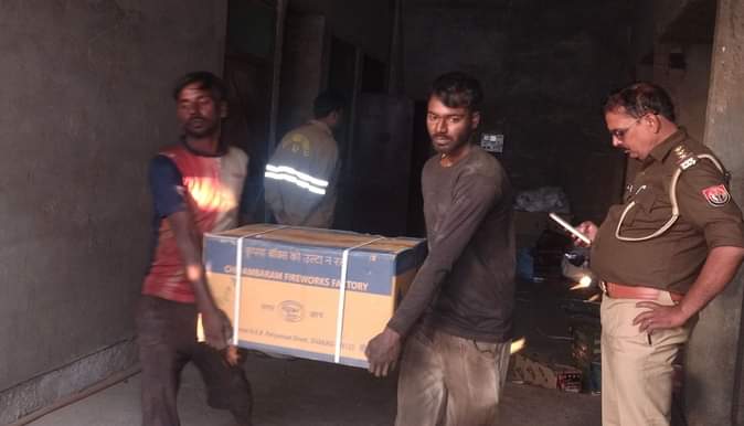 गोले, महताब, राॅकेट, भारी बारूदयुक्त सामग्री और विभिन्न प्रकार की आतिशबाजी इतनी मात्रा में थी कि सात पिकअप वाहनों से सामान को सुरक्षित स्थान पर ले जाना पड़ा। पूरी प्रक्रिया देर शाम तक चलती रही।