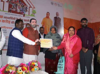 नगर पालिका हाल में आयोजित पीएम आवास के लाभार्थीओं को स्वीकृति पत्र देते राज्यमंत्री सतीश चंद्र