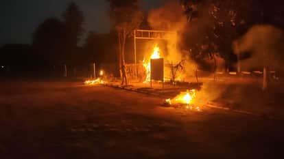 पुलिस लाइन ग्राउंड में हवाई हमले के दौरान लगी आग ।