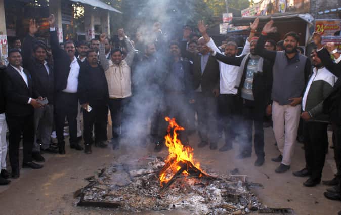 कचहरी में अधिवक्ता की कुर्सी व बेंच जलाते अधिवक्ता।