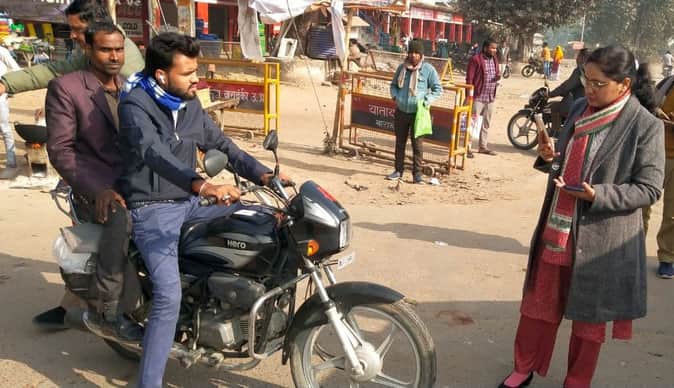 लखनऊ-अयोध्या मार्ग पर चेकिंग के दौरान बिना हेलमेट पाए जाने पर चालान करतीं एआरटीओ अंकिता शुक्ला।