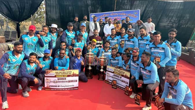 लॉर्ड्स बालाजी क्रिकेट ग्राउंड आयोजित मैच में ट्रॉफी के साथ विजेता टीम।