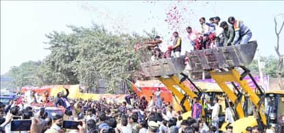 लखनऊ-अयोध्या हाईवे पर बुलडोजर पर चढ़कर भाजपा प्रदेश अध्यक्ष पंकज चौधरी का फूल बरसाकर स्वागत करत