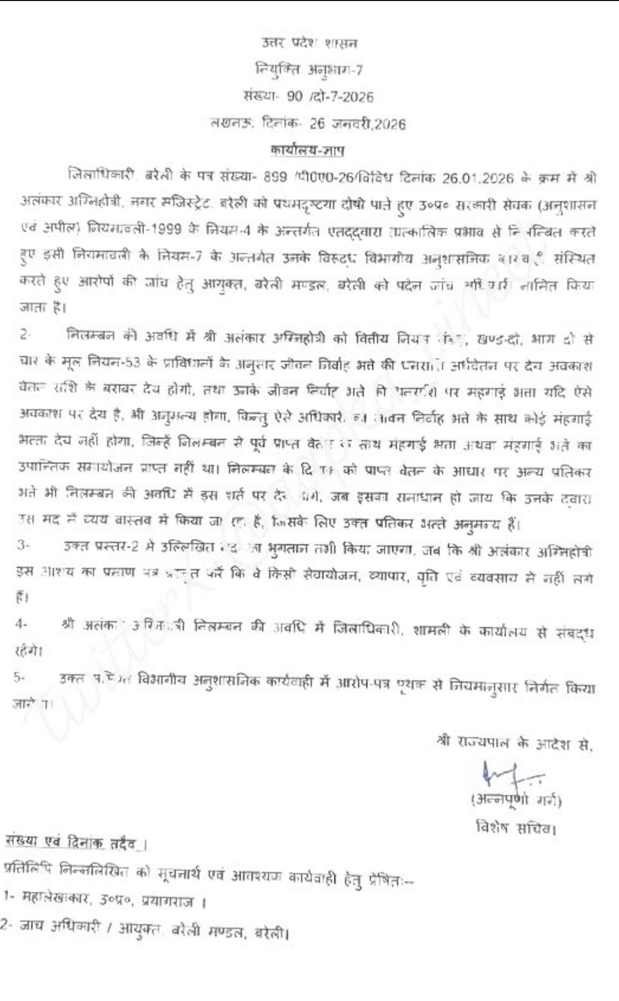 Bareilly News: बरेली के सिटी मजिस्ट्रेट अलंकार अग्निहोत्री को प्रदेश सरकार ने निलंबित कर दिया। उन्हें शामली के कलेक्टर ऑफिस से अटैच किया गया है। मामले की जांच मंडलायुक्त बरेली को सौंपी गई है।