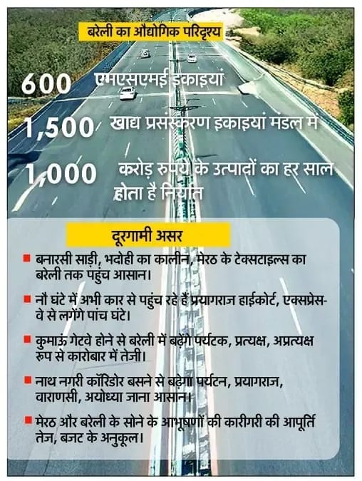 मेंथॉल एवं इत्र निर्यातक गौरव मित्तल के मुताबिक रुहेलखंड मेंथॉल का प्रमुख केंद्र है। सालाना पांच हजार करोड़ का टर्नओवर है। जो एक्सप्रेस-वे से और बढ़ेगा। डीलरों की फैक्ट्री विजिट, क्वालिटी चेकिंग आसान होने से उत्पादों की मांग बढ़ेगी। जरी निर्यातक सुदीप रजगडिया के मुताबिक जरी उत्पाद का निर्यात आसान होने से कामगारों की आय बढ़ेगी। फर्नीचर, बांस-बेत समेत अन्य पारंपरिक उद्योगों को राष्ट्र स्तरीय पहचान मिलेगी।