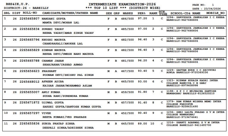 UP Board Class 12th Result 2026 : उत्तर प्रदेश माध्यमिक शिक्षा परिषद (यूपी बोर्ड) ने हाईस्कूल और इंटरमीडिएट परीक्षा परिणाम जारी कर दिया है। इंटरमीडिएट में बरेली की पांच छात्राओं ने यूपी टॉप 10 सूची में जगह बनाई है। ये सभी छात्राएं सर्वोदय जनकल्याण इंटर कॉलेज खेड़ा की हैं।