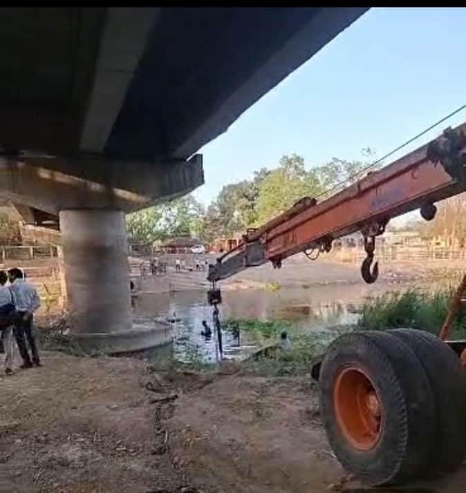कुआनो नदी में मलबा हटाती क्रेन मशीन। संवाद
