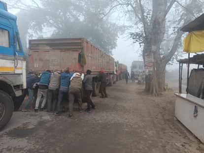 लालगंज एसबीआई बैंक के पास खराब हुए ट्रेलर को धक्का देते लोग संवाद
