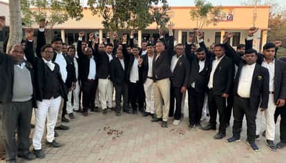 न्यायालय परिसर में पुलिस का विरोध जताते अधिवक्ता। संवाद
