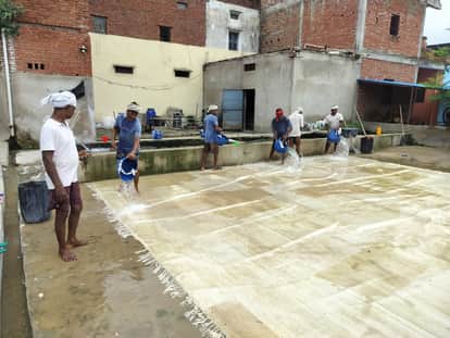 भदोही नगर के एक उत्पादन इकाई में कालीनों की धुलाई करते मजदूर। स्रोत- संवाद
