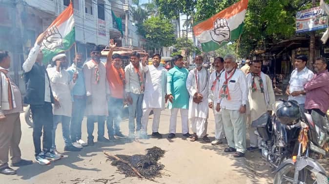 नगर के स्टेशन रोड पर असम सीएम का पुतला फूंकते कांग्रेस कार्यकर्ता। स्रोत- आयोजक