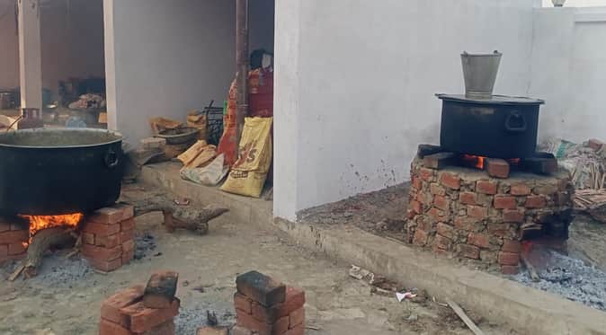 भिदिउरा में एक कार्यक्रम में गैस सिलेंडर न मिलने पर भट्ठी पर पक रहा भोजन। संवाद