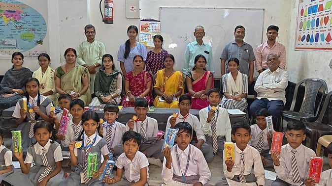 नई बाजार गोपाल विद्या मंदिर में सम्मानित छात्र-छात्राओं के साथ शिक्षक। संवाद