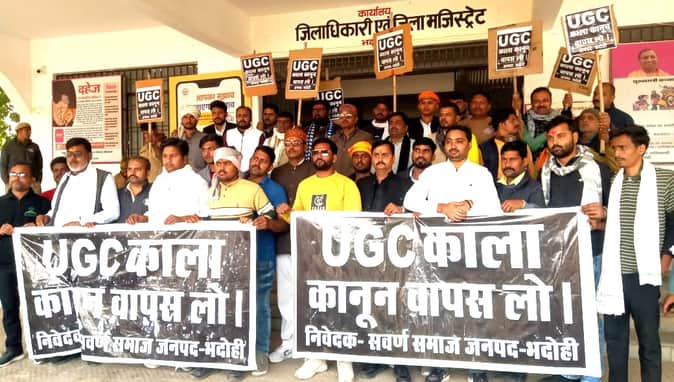 बृहस्पतिवार की दोपहर में कलेक्ट्रेट पहुंचकर लोगों ने प्रदर्शन करते हुए कहा कि यूजीसी की ओर से लाए गए नए नियमों से सामान्य वर्ग के विद्यार्थियों व व्यक्तियों का उत्पीड़न बढ़ेगा। द्वेषवश की गई झूठी शिकायतों पर भी सामान्य वर्ग के विद्यार्थियों को दंड का सामना करना पड़ेगा। इससे उनका भविष्य चौपट होगा। कहा कि उक्त कानून में पूर्व शिक्षा विशेषज्ञ, राज्य सरकार, विश्वविद्यालय समुदाय एवं छात्र प्रतिनिधियों से पर्याप्त परामर्श नहीं होने के कारण एकपक्षीय व असंतुलन बढ़ने की संभावना है, जो अन्यायपूर्ण है। प्रदर्शन में शुभम पाठक, रजनीश पांडेय, विकास तिवारी, धीरज दुबे, विजय कुमार सिंह, शिवम उपाध्याय, पंकज शुक्ल, सुरेश शुक्ल, शिवांश पांडेय, सिद्धार्थ मिश्र, अनुज पाठक आदि रहे। डीघ ब्लॉक के तुलसीकला गांव के रामलीला मैदान में विश्वविद्यालय अनुदान आयोग यूजीसी के नए नियमों के खिलाफ प्रदर्शन किया गया। विभिन्न गांव से जुटे ग्रामीणों ने प्रधानमंत्री का प्रतीकात्मक पुतला जलाया।