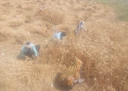 भिदिउरा गांव में गेहूं की कटाई करते किसान। संवाद