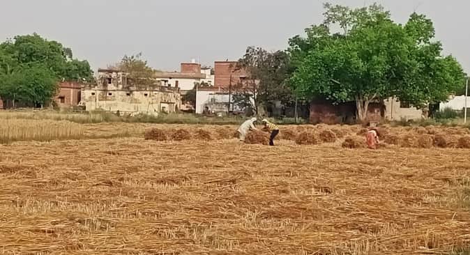 भिदिउरा में गेहूं का बोझ बांधते किसान। संवाद