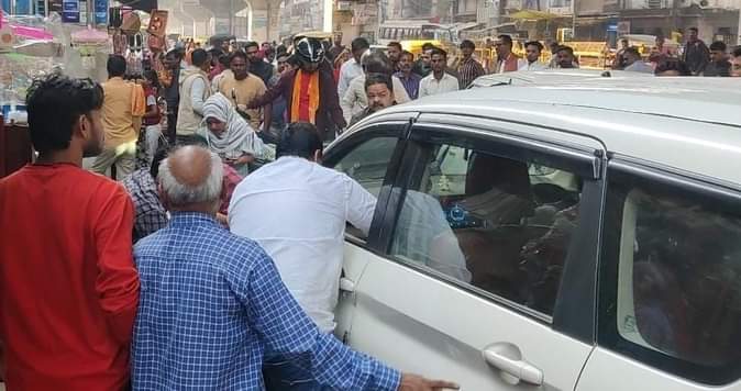 गोपीगंज चौराहे पर चालक को दौरा आने पर कार से ऑटो और बाइक में टक्कर के बाद खड़े लोग। संवाद