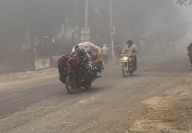 सुबह के समय छाए धुंध में जाते लोग। संवाद