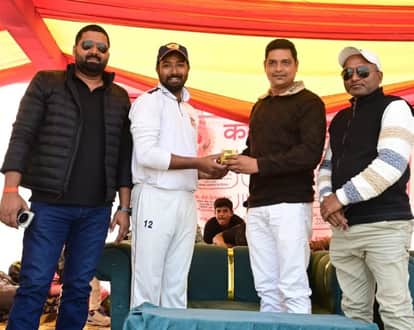 मोढ़ चैंपियनशिप क्रिकेट टूर्नामेंट में खिलाड़ी को पुरस्कार देते अतिथि। स्रोत आयोजक