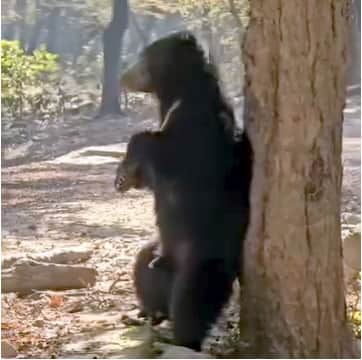 अमानगढ़ के जंगल में पेड़ से अपनी पीठ खुजाता भालू। स्रोत वीडियो ग्रैब