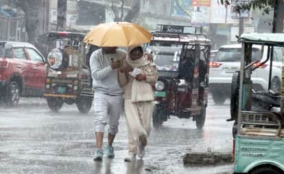 बिजनौर मे बारिश में छाता लगाकर जाते महिला पुरूष। संवाद