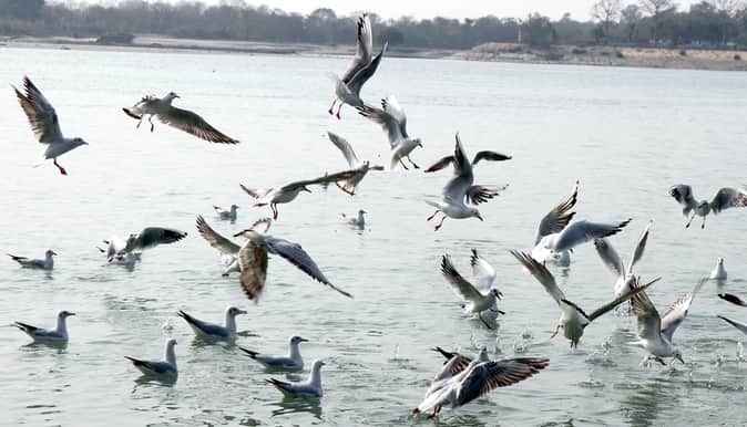 भूख का संघर्ष। बिजनौर में बैराज पर गंगा में श्रद्घालु आटे की गोलियां मछलियों को खिला रहे थे। इ
