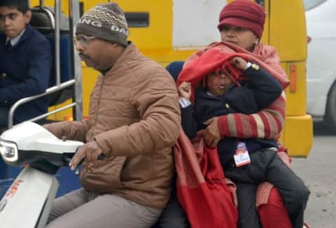 बिजनौर में कड़ाके की ठंड में बच्चों को गर्म कपड़ों में लपेटकर स्कूल छोड़ने जाते अभिभावक। संवाद
