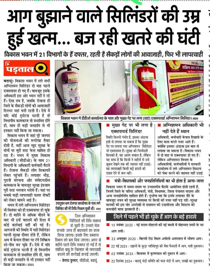 बदायूं। विकास भवन की सुरक्षा व्यवस्था को लेकर अमर उजाला में प्रकाशित खबर का असर दिखाई दिया। लंबे समय से एक्सपायर पड़े सभी अग्निशमन सिलिंडर अब रीफिल करा दिए गए हैं। सभी मंजिलों, गलियारों, मीटिंग हॉल और मुख्य गेट पर लगाए गए अग्निशमन सिलिंडर अब सक्रिय हालत में हैं।