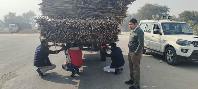 गन्ना लदे ट्रैक्ट्रर- ट्राली में रिफ्लेक्टर लगवाते परिवहन विभाग के अधिकारी। स्रोत- विभाग