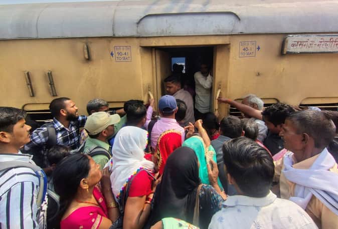 ट्र्रेन पर चढ़ने को मारामारी। संवाद