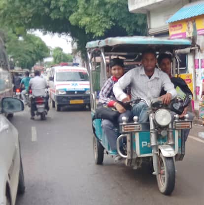 ई-रिक्शा से जाते स्कूली बच्चे। संवाद