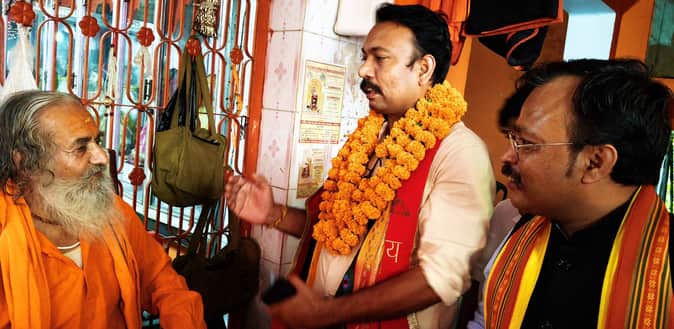 जलालाबाद स्थित परशुराम मंदिर के महंत से आशीर्वाद लेते अलंकार अग्निहोत्री। संवाद