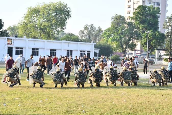 अभ्यास के प्रथम चरण में लाउडस्पीकर के माध्यम से प्रदर्शनकारियों को शांतिपूर्वक समझाने का प्रयास किया गया। स्थिति नियंत्रण से बाहर होते देख पुलिस ने चरणबद्ध कार्रवाई करते हुए चेतावनी जारी की। इसके बाद अश्रु गैस के गोले, रबर बुलेट, हैंड ग्रेनेड और वाटर कैनन का प्रयोग कर भीड़ को तितर-बितर करने की रणनीति का प्रदर्शन किया गया।
