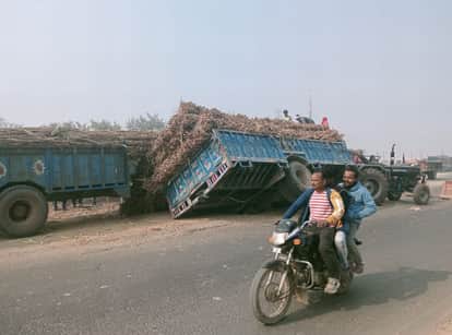 एमएफ हाईवे पर बनकोटा गांव के पास कोहरे में पलटी गन्ने से लदी ट्राली। संवाद