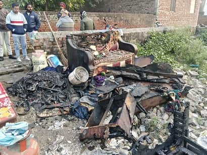 कुंवरगांव में घर के बाहर रखा जला हुआ सामान। संवाद