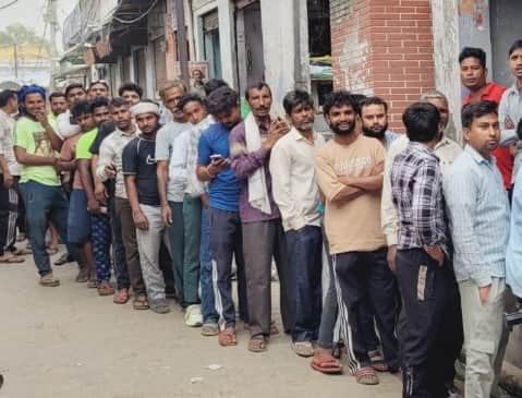 खानपुर की गैस एजेंसी पर सिलिंडर पाने के लिए लाइन में लगे उपभोक्ता। संवाद