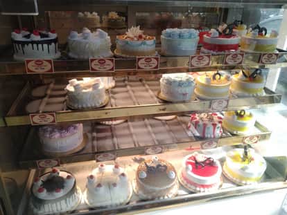 नगर की एक बेकरी पर बिक्री को रखे केक। संवाद