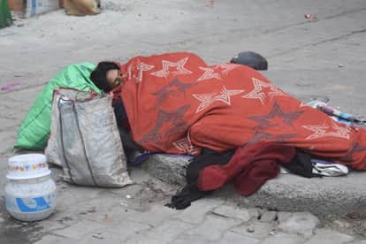 मांगकर गुजारा करने के बाद थक हारकर जमीन पर सोती महिला... रविवार जिला अस्पताल के परिसर में ठंड स