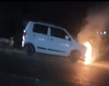 देहात कोतवाली क्षेत्र में शुक्रवार देर रात अनूपशहर मार्ग पर कार में लगी आग। स्रोत: सोशल मीडिया