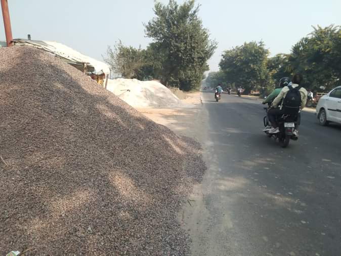 गांव चरौरा मुस्तफाबाद के बाहर सड़क किनारे खुले में रखी निर्माण सामग्री। संवाद