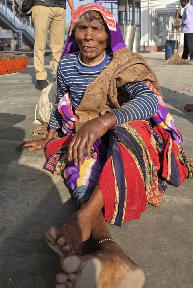 खुर्जा जंक्शन स्थित रेलवे स्टेशन पर बैठी लावारिस वृद्ध महिला। संवाद