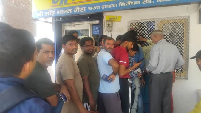 एक एजेंसी पर सिलिंडर लेने के लिए लगी लोगों की लाइन। संवाद