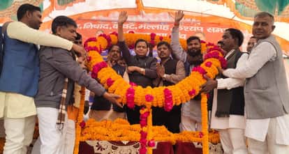 धानापुर के अहिकौरा में आयोजित सम्मेलन में भदोही से भाजपा सांसद डॉ.विनोद बिंद का माल्यार्पण करते